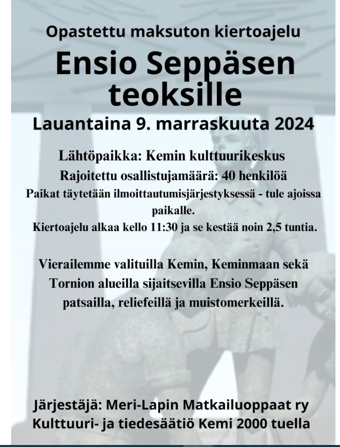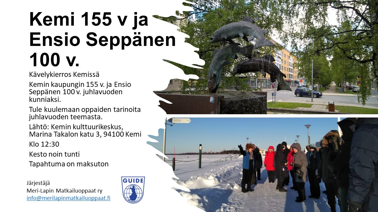 Kemin kaupungin 155 v. ja Ensio Seppäsen 100 v. juhlavuoden kunniaksi Kävelykierros Kemissä kaupungin perustamispäivää juhlistaen tiistaina 5.3.2024 Meri-Lapin Matkailuoppaat ry järjestää kävelykierroksen Kemin kaupungin keskustassa juhlistaen kaupungin 155 juhlavuotta sekä taiteilija professori Ensio Seppäsen 100 vuotisjuhlaa. Kierroksella oppaat kertovat tarinoita kaupungin historian vuosiajoilta, sekä Ensio Seppäsen taideteoksien tarinaa. Päivä tiistai 5.3.2024 Lähtö klo 12:30 …