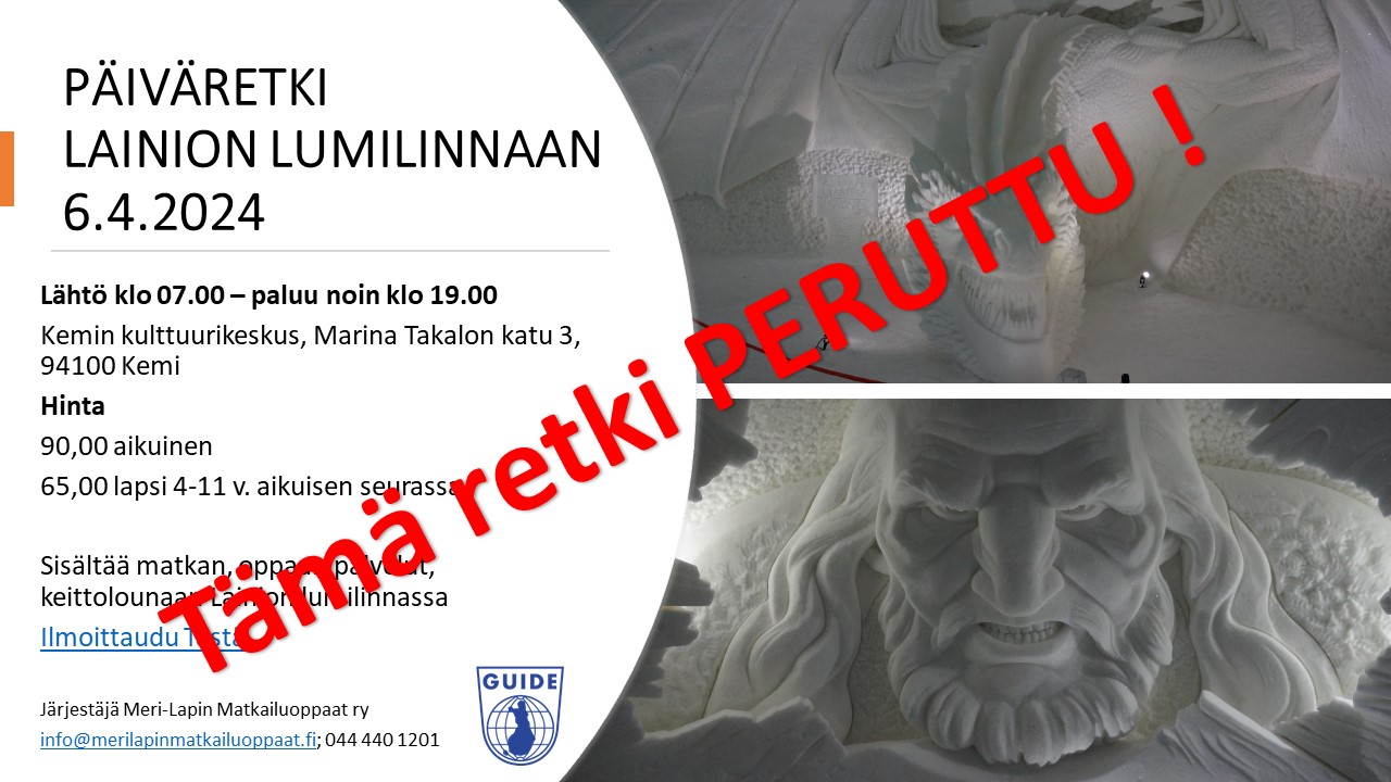 Lähde mukaan kokemaan pohjoismaisen mytologian ihmeet Lainion lumilinnassa HARMILLISESTI TÄMÄ RETKI ON JOUDUTTU PERUMAAN! tämä Lainion retki joudutaan perumaan muuttuneiden olosuhteiden vuoksi. Pahoittelemme kaikkia kiinnostuneita ja retken varanneita. Mahdolliset ennakkomaksut on palautettu asianomaisille. Kiitos ja toivotaan, että joku toinen kerta voimme järjestää vastaavan retken. Meri-Lapin Matkailuoppaiden päiväretki taianomaiseen lumen ja jään maailmaan Lappland Hotelsin Snowvillageen …