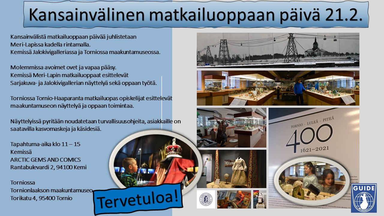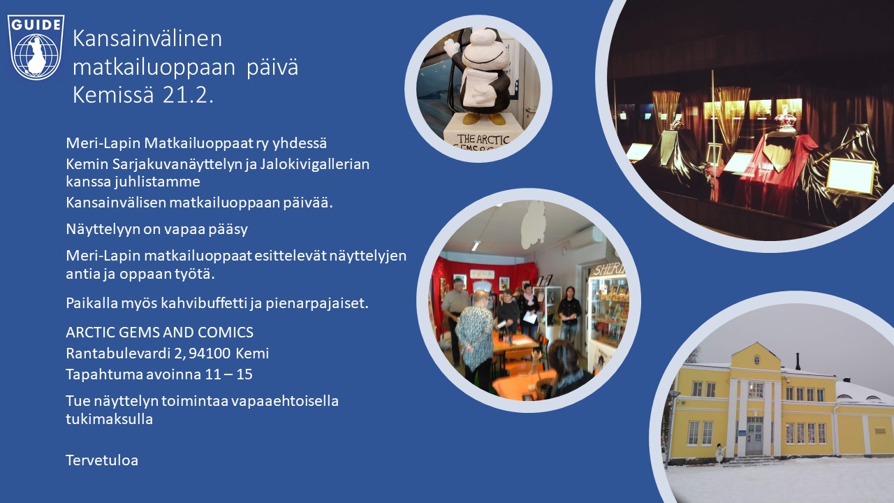 Meri-Lapin Matkailuoppaat ry yhdessä Kemin Sarjakuvanäyttelyn ja Jalokivigallerian kanssa juhlistamme Kansainvälisen matkailuoppaan päivää sunnuntaina 21.2. esittelemällä maailman pohjoisimman pysyvän sarjakuvanäyttelyn ja Euroopan laajimpaa ja monipuolissta jalokivi-ja korukivinäyttelyä kruunukalleuksineen. Näyttelyyn on vapaa pääsy toiveena kuitenkin vapaamuotoinen tukimaksu näyttelyjen toiminnan tukemiseen. Meri-Lapin matkailuoppaat esittelevät näyttelyjen antia ja oppaan työtä Paikalla myös kahvibuffetti ja pienarpajaiset Tervetuloa turvallisuus huomioiden …