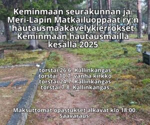 Meri-Lapin Matkailuoppaiden ja Kemin seurakunnan kävelykierrokset Kllinkankaalla ja Mikaelin kirkon kirkkotarhassa torstaisin 26.6.2025, 24.7.2025 ja 7.8.2025. Keminmaan seurakunta ja Meri-Lapin Matkailuoppaat ry järjestävät tänä kesänä kävelykierroksia Keminmaan seurakunnan hautausmaalla Kallinkankaalla ja vanhan kirkon kirkkotarhassa.Kallinkankaan hautausmaalla järjestetään opastettuja kierroksia kolmena torstaina: 26.6., 24.7. ja 7.8. Kierrokset alkavat kello 18:00 ja kestävät noin 1,5 tuntia.Vanhan kirkon kirkkotarhan …